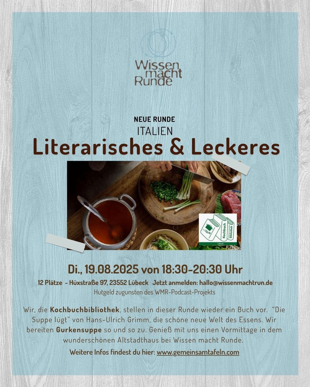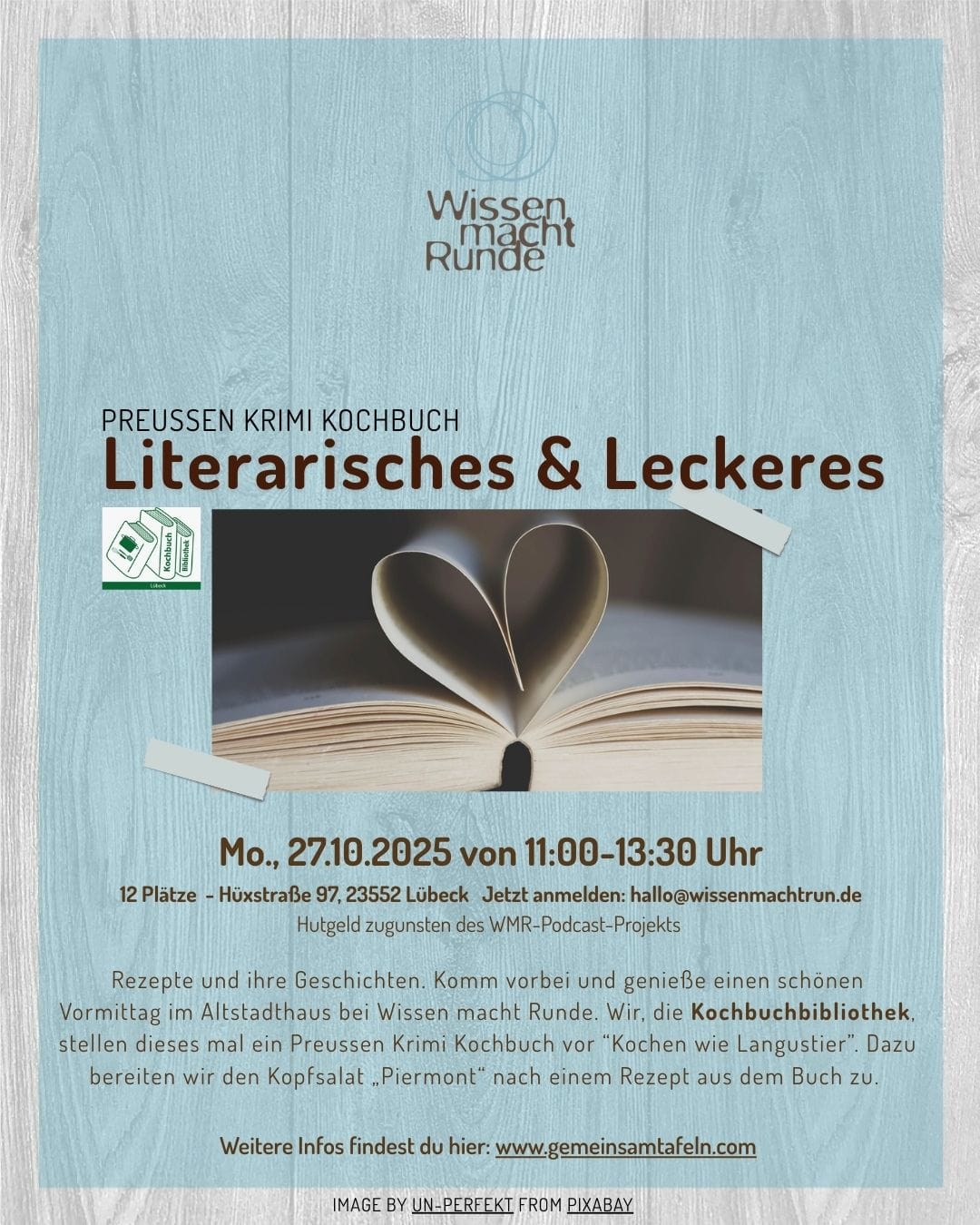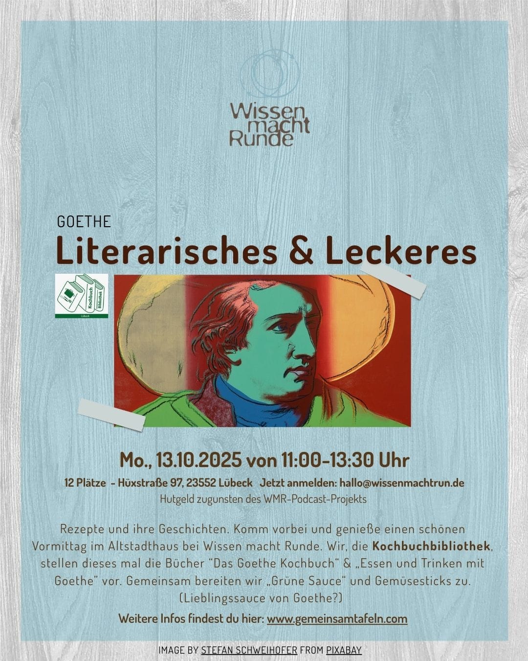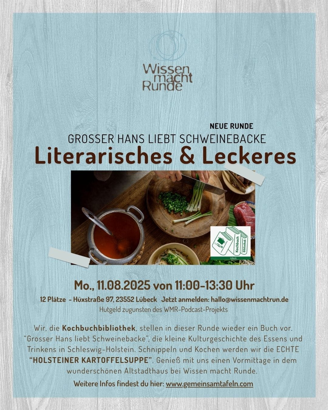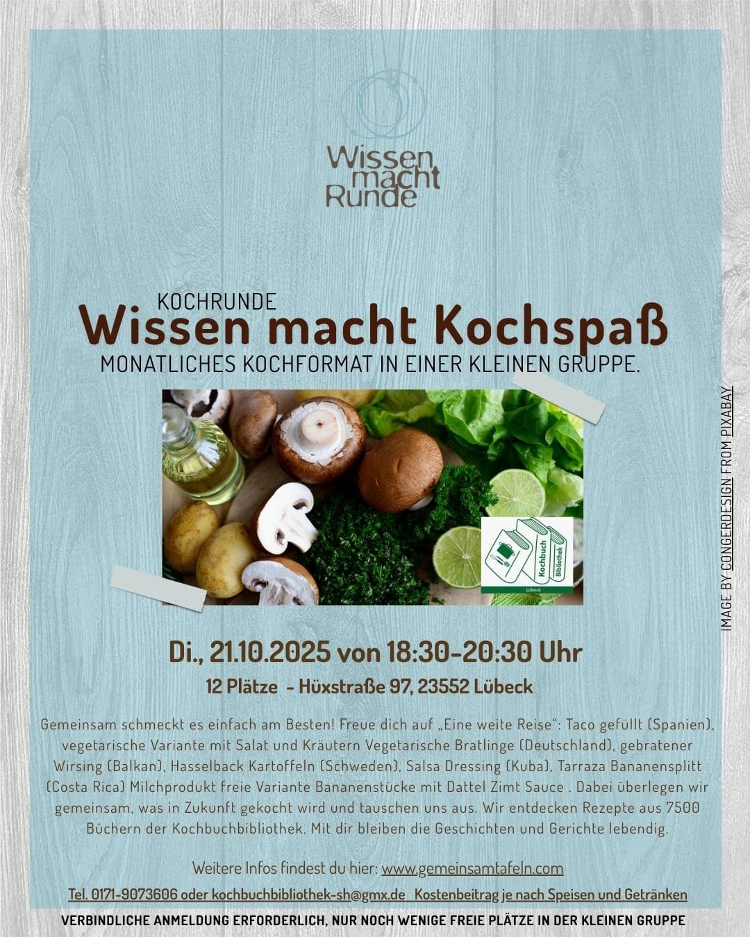 Kostenbeitrag nach Rezepten wird eingesammelt. Anmeldung erforderlich an: hallo@wissenmachtrun.de oder kochbuchbibliothek-sh@gmx.de